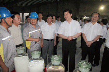 河南省商丘市委書(shū)記陶明倫(右二)、市長(zhǎng)余學(xué)友(右三)觀看寧陵公司生產(chǎn)的產(chǎn)品,左三為寧陵公司總經(jīng)理王經(jīng)明